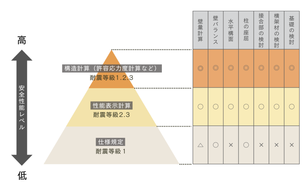 住まいの自重、建物内の人・家財等の積載荷重、積雪、さらには地震力・風圧力に対して、建物全体・1本1本の柱・梁などの構造部材・接合部・基礎がどのように変形し、どれくらい耐えられるかを計算によって検証し、安全となるよう設計。