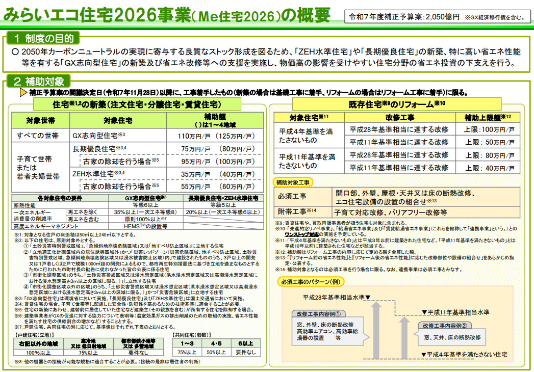 今年に引き続き、GX志向型住宅・長期優良住宅・ZEH水準住宅に対し、補助金があります。